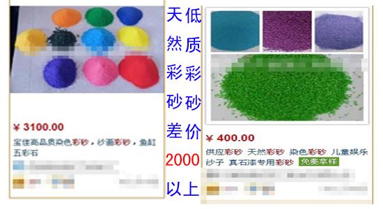 2,彩砂:市場上彩砂售價每噸大約在300-3000元之間不等。價格差距非常大。低質量的彩砂,價格一般在300-400不等,粉塵多,調色時需添加色漿,做出來的真石漆會非常渾濁,沒有天然彩砂的通透和亮麗。