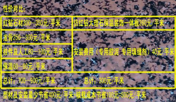 紅鉆大理石是大理石中應用比較廣泛的品種,但資源有限,安裝繁瑣,價格也比較昂貴;如何節約自然資源,減少對環境的破壞,還要保留紅鉆大理石的裝飾效果呢?飾壁涂料是沈陽地區保溫裝飾一體板的生產廠家,獨家推出集防火,保溫,節能,裝飾,環保為一體的仿紅鉆大理石保溫裝飾板,每平節約成本300~500元,還免去天然紅鉆大理石每3~5年的維護費用。有圖有真相,我們一起來看看以下圖片就一目了然了!
