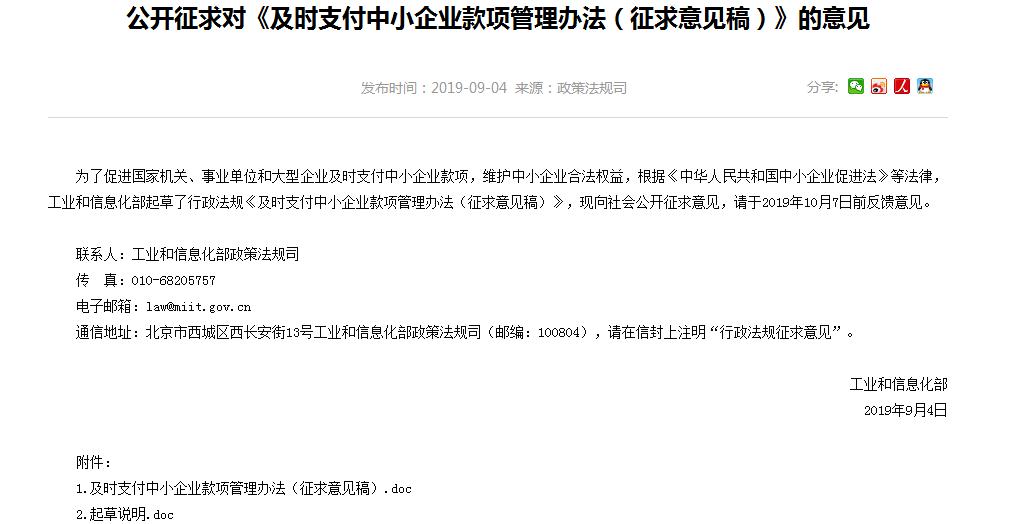 2019年9月4日,工信部發布《及時支付中小企業款項管理辦法(征求意見稿)》,明確提出: