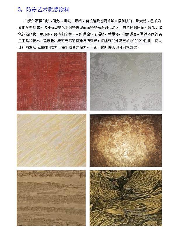 防凍(抗凍,負溫,耐寒)質感漆是防凍系列建筑裝飾材料的一種,也叫防凍質感涂料,包括防凍調色質感涂料、防凍天然彩砂質感涂料、防凍藝術質感涂料等,需要配合本公司生產的防凍膩子,防凍底漆、防凍罩光漆等使用,是由飾壁公司研發的獨家防凍系列產品。